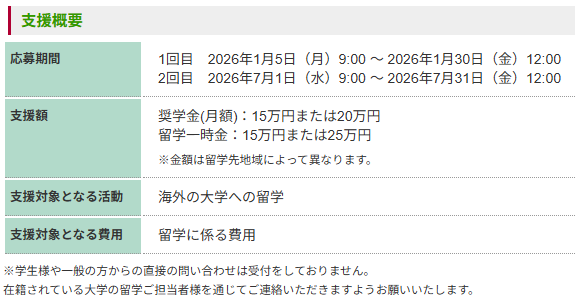 - 対象留学期間:2026年1月12日~ 2026年10月31日