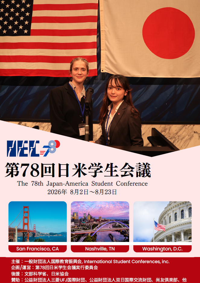 🇺🇸🇯🇵【日米学生会議】シリーズ🇯🇵🇺🇸「第78回日米学生会議 」参加者募集(2025/11/7) 概要 開催期間:2026年8月2日(日)~8月23日(日) 分科会テーマ(7分野) オンライン個別説明会 第77回報告会・第78回説明会 |
