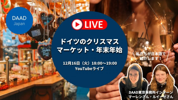 【🇩🇪DAAD ドイツ学術交流会】🇩🇪🎨ドイツのクリスマスマーケット・年末年始(2025/11/21) ドイツのクリスマスマーケットで人気な街やその歴史は?大晦日やお正月は、ドイツではどのように祝うの? 開催期間:2025年12月16日(火)18時~ |