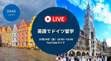 【🇩🇪DAAD YouTubeライブ】シリーズ🇩🇪🎨英語でドイツ留学(2025/10/20) ドイツの大学では、ドイツ語だけでなく英語で学べるプログラムも数多く開講されています。 📅 日時:2025年10月24日(水)18:00から 💡 内容:英語でドイツに留学した先輩たちの体験談をお届けします! |