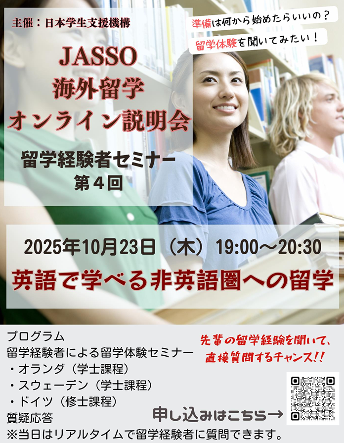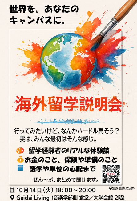 【海外留学説明会 】(2025/9/8掲載)NEW「興味はあるけど、何から始めたらいいかわからない」 当日は、留学に役立つ情報の紹介や、先輩の体験談発表、 ※会場や申込方法などの詳しい情報は、決まり次第このページでお知らせします。